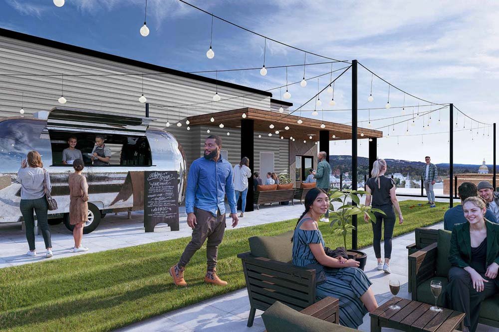 Behind the main building, the courtyard will host a 1942 Silk City Dingman Diner, owned by the late Michael Dingman, a renowned New Hampshire businessman and philanthropist. This beautifully restored diner, considered one of the best in the country, will be perfect for events like a private wine night, retirement parties, birthday celebrations and pop-up special event dinners and parties. The area also includes an outdoor three-season courtyard, providing a versatile space for various gatherings. Designed and build by PROCON, a fourth generation, 90-year-old fully integrated team that has received national recognition for their true design-build delivery system.
