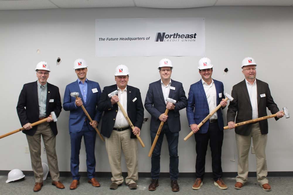 This morning, Northeast Credit Union’s senior leadership team and Board Members along with Robert Carrier, the Mayor of Dover and executives from PROCON’s design-build team, Tidemark, Kane Company, Maugel DeStefano Architects and law firm Sheehan Phinney all gathered for a “wall smashing” ceremony at the future headquarters. During the event, participants had a first look at renderings and designs before taking sledgehammers to walls to mark the start of the demolition process.