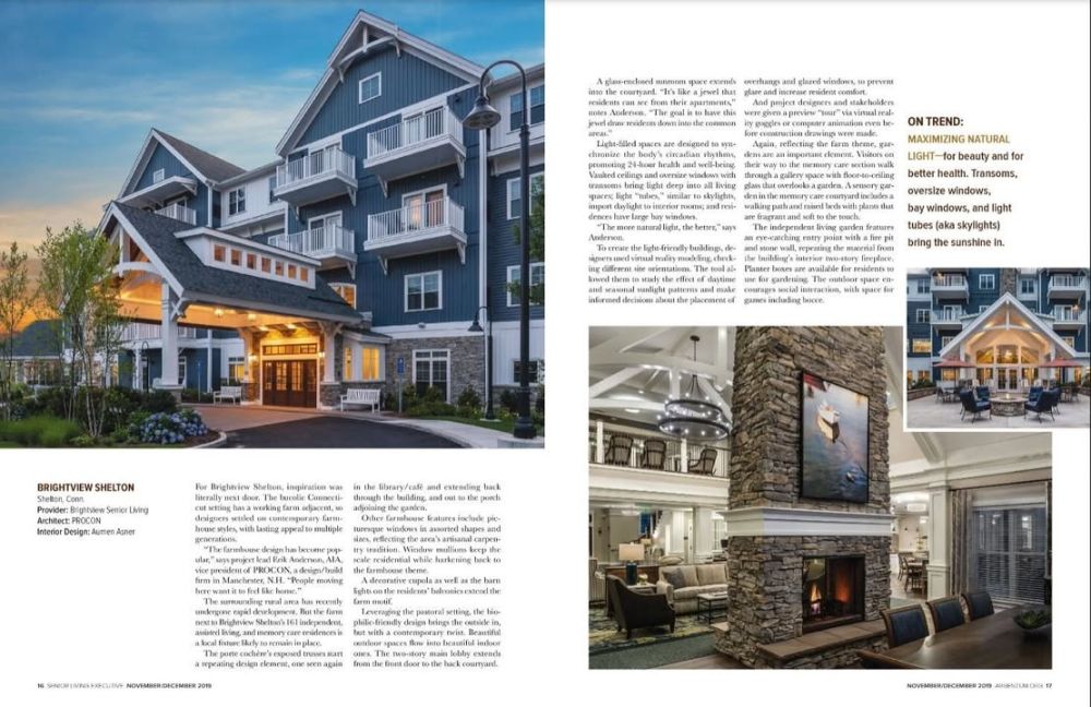 ๐ฃ๐ฅ๐ข๐๐ข๐ก ๐๐ถ๐๐๐ผ๐ฟ๐ - ๐ต๐ฌ ๐ฌ๐ฒ๐ฎ๐ฟ๐: In December 2019, PROCONโs Architecture Team was recognized as a winner of the 2019 Argentum Senior Living by Design Award. The 168,000 SF design was featured in the December 2019 issue of Senior Living Executive Magazine. The community was selected from among national submissions for its embodiment of Argentumโs 2019 theme โA Certain Sense of Place.โ The community is lodged in the Connecticut countryside adjacent to Wells Hollow Farm between New Haven and Bridgeport. https://bit.ly/3LLWN7T
